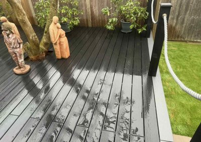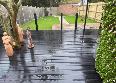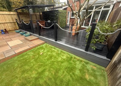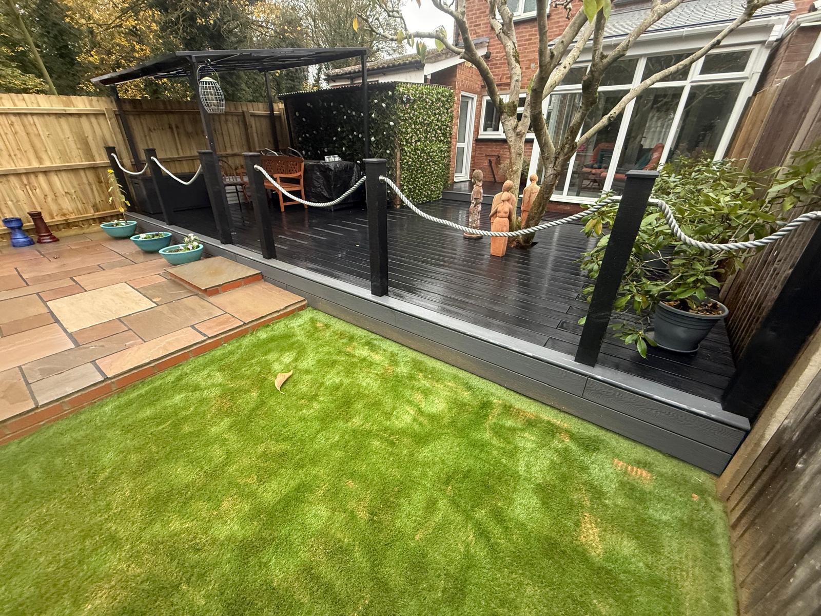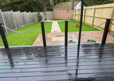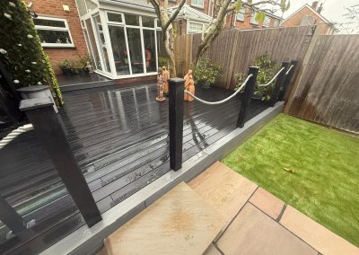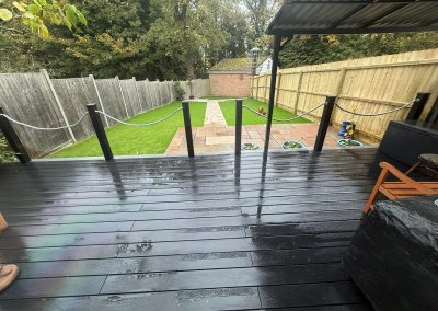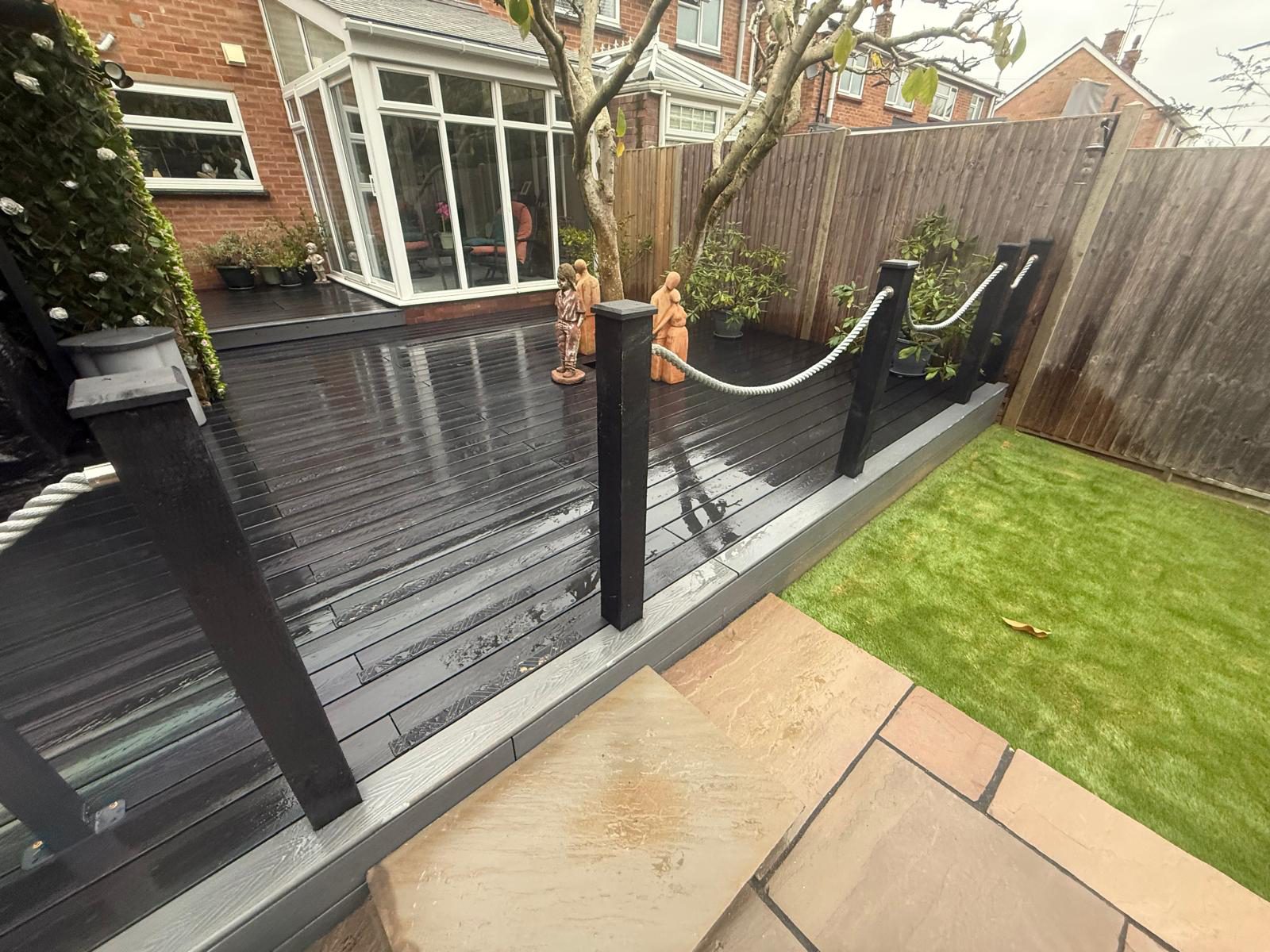 The lower level is finished with lush artificial grass, providing a vibrant, low-maintenance lawn that stays green year-round. The upper deck area, finished in dark-stained timber, adds a sleek, modern touch and serves as a perfect space for relaxation or entertaining. It’s complemented by black posts and rope balustrades, which subtly divide the zones while maintaining an open, airy feel.