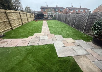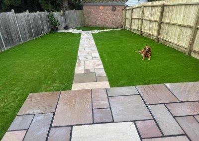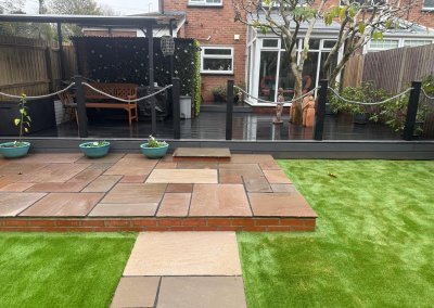 The garden landscape features a multi-level layout, with a raised patio area constructed from natural sandstone paving in warm, earthy tones. The patio is bordered with red brick edging, adding a neat and classic finish that contrasts nicely with the contemporary design elements. A central stone pathway leads from the lawn up to the patio, creating a clear and inviting route through the garden.